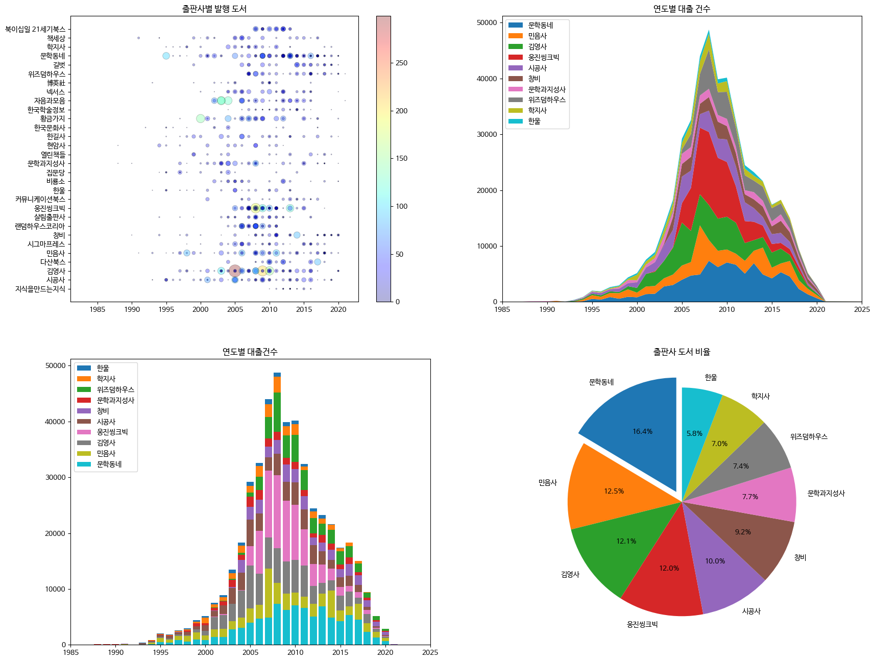 sc=axes[0,0].scatter(ns_book8['발행년도'], ns_book8['출판사'], linewidths=0.5, edgecolors='k',alpha=0.3,s=ns_book8['대출건수'],c=ns_book8['대출건수'],cmap='jet')
