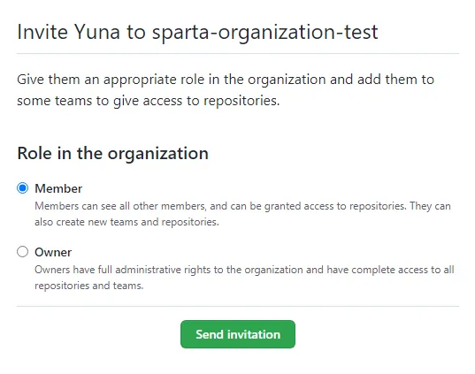 3) 초대할 사용자의 권한을 설정하고, Send invitation 버튼을 눌러 사용자에게 초대장을 발송합니다.