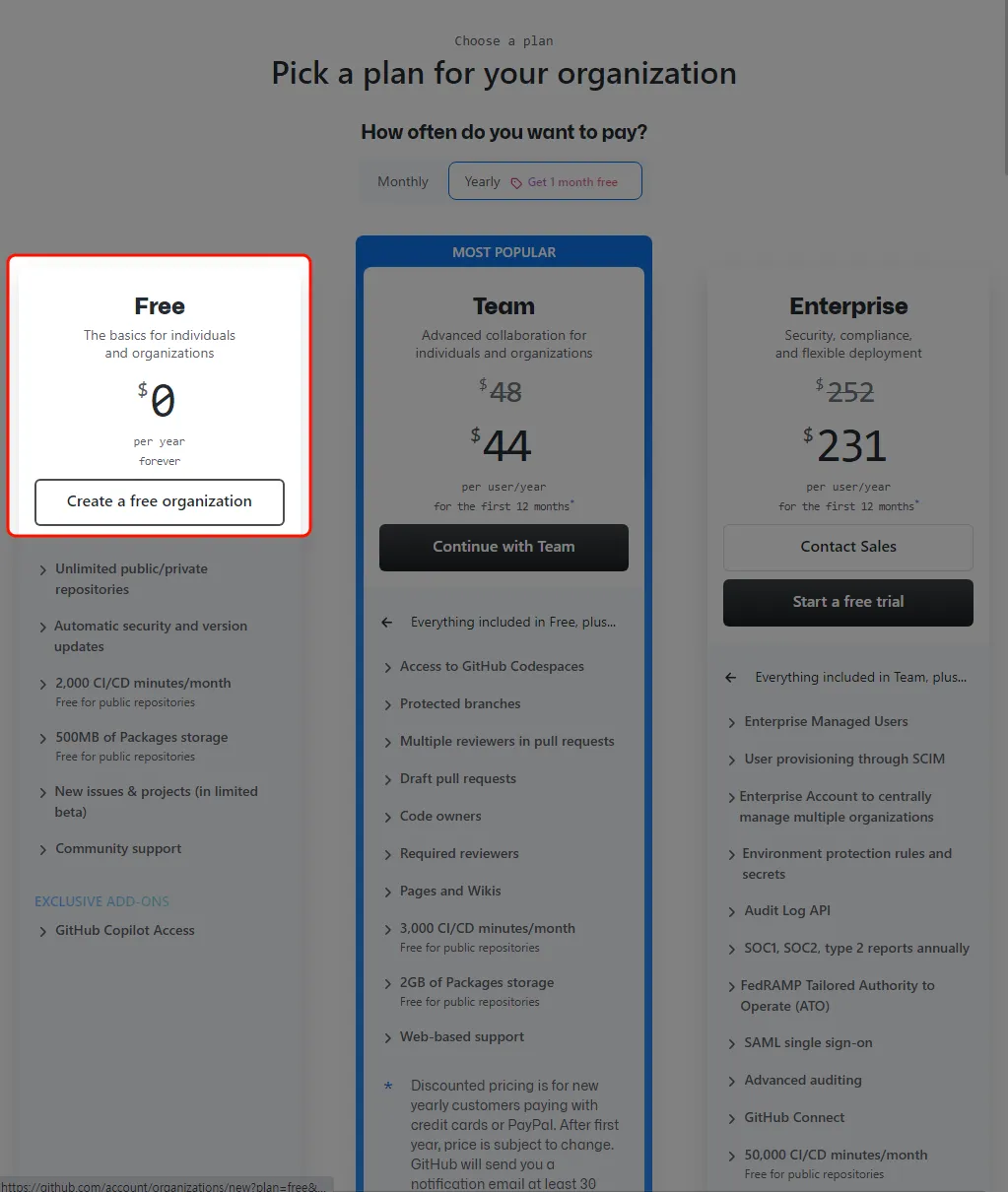 2) Create a free organization을 눌러 무료 단체 계정을 생성합니다.