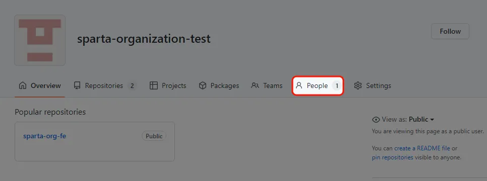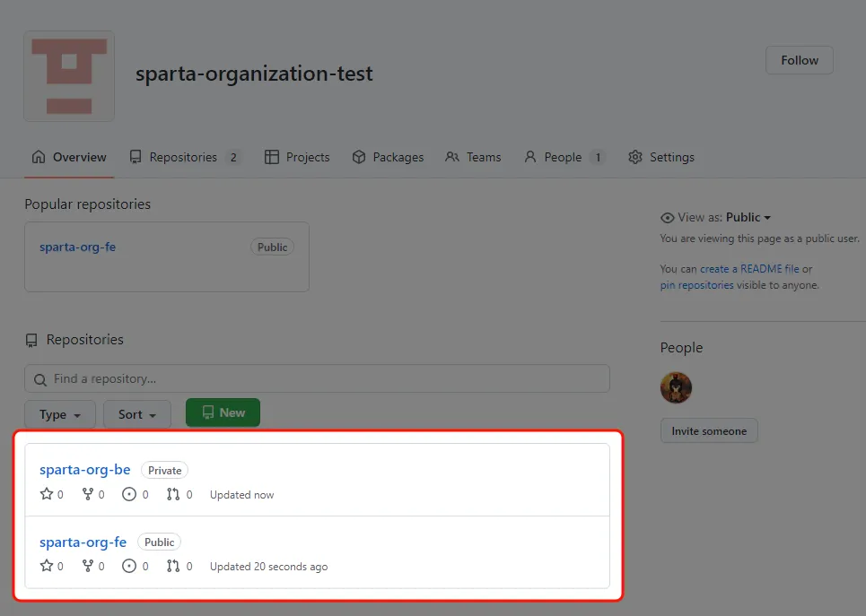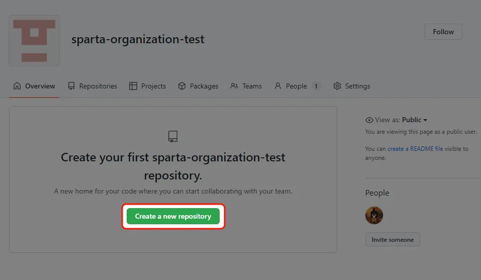 이후 Create a new repository 버튼을 통해 organization 내에 새 저장소를 생성할 수 있습니다.