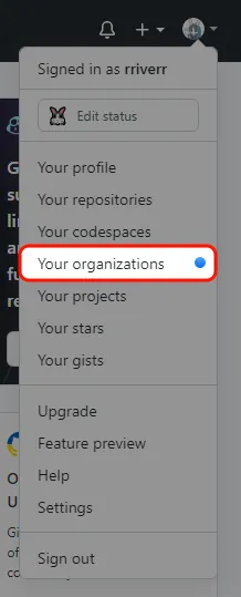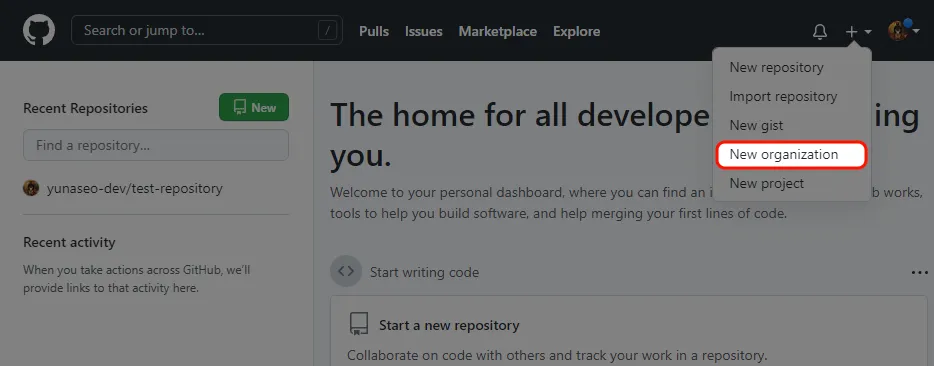 1) 상단의 + 항목 내의 New organization을 선택해주세요.