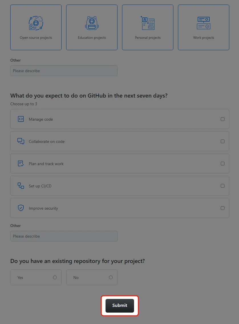 5) 다음은 설문 항목입니다! 따로 입력 없이 Submit 버튼을 통해 단계를 넘어갈 수 있습니다.