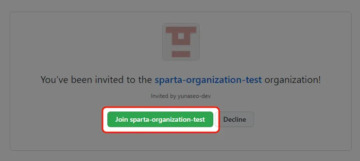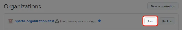 5) 사용자는 이메일로 발송된 초대장, 혹은 GitHub 계정의 Your organization 항목에서 Join 버튼을 눌러 초대를 수락할 수 있습니다.