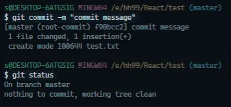 git commit -m "커밋 메시지"를 입력해 추가한 파일을 commit 합니다.git status 명령어를 통해 다시 확인해 볼까요?