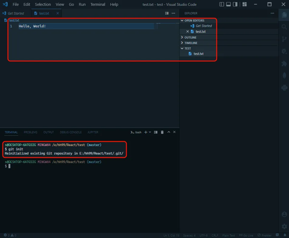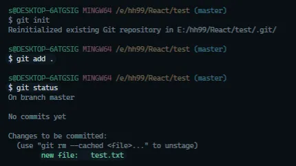 git add .을 입력해 생성한 파일 모두 working tree에 추가합니다.git status 명령어를 통해 제대로 추가되었는지 확인할 수 있습니다.