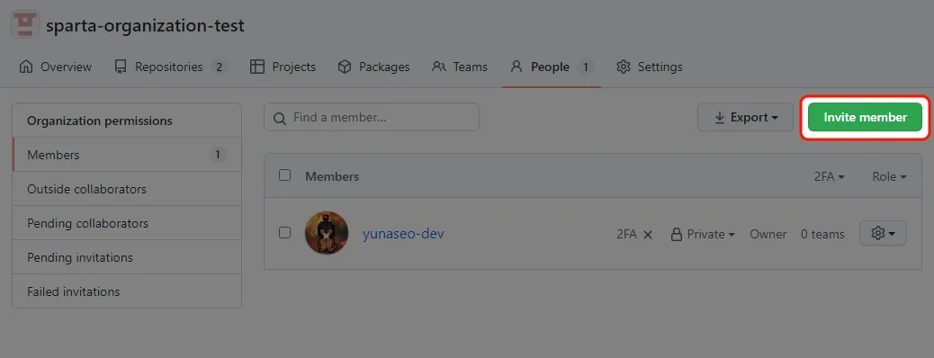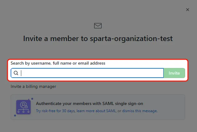 2) Invite member 버튼을 누르고, 초대할 사용자의 username, 혹은 이메일을 입력해 초대합니다.