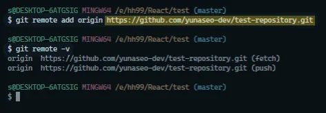 git remote add origin [https://저장소url.git](https://저장소) 을 입력해 조금 전에 생성했던 저장소를 연동합니다. git remote -v 명령어를 통해 연결이 잘 되었는지 확인할 수 있습니다.