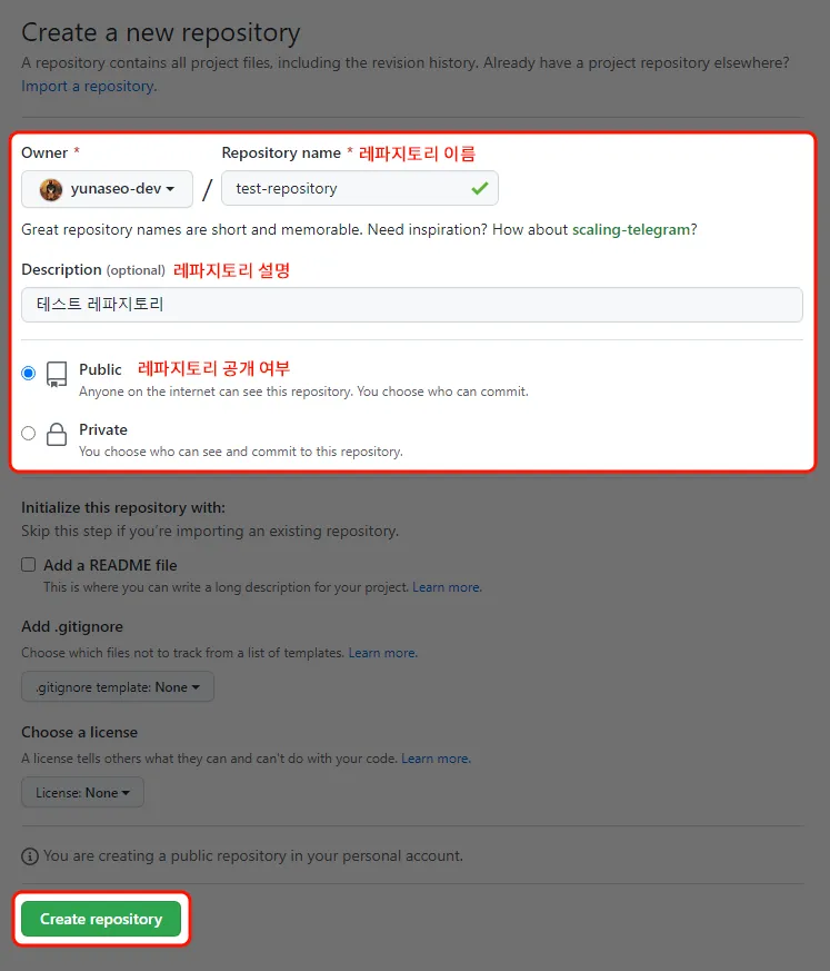 GitHub 메인 화면 좌측 상단의 Create repository나 우측 상단의 +를 눌러 레파지토리 생성 페이지로 이동합니다.