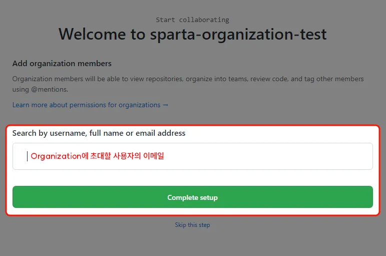 4) Organization에 초대할 사용자의 이메일을 입력하고, Complete setup 버튼을 눌러주세요.