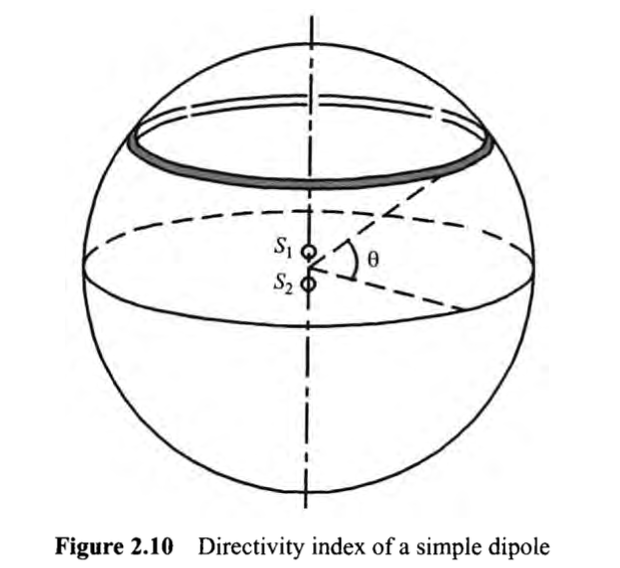 S1과 S2는 구의 중심에 위치해있다. 현재 색칠된 영역을 지나가는 Sound flux(Sound power)는 다음과 같은 식으로 구해진다.
