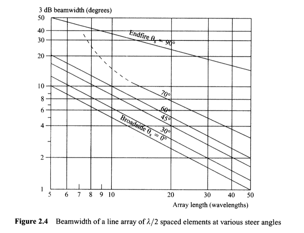 위 함수를 사용하여 그림 2.4를 그렸다. 이것에 대해 설명을 하면 조향 각도가 90도인 엔드파이어(endfire) 위치에서는 빔 패턴이 탐조등 모양이며, 좌우 대칭이 없다. 반면에, 90도에 가까운 전환 영역에서는 3 dB 빔폭이 모호해질 수 있다. 빔이 조향될 때 빔폭은 변하지만 배열의 지향성 지수(directivity index)는 대략적으로 일정하다고 설명하고 있다.