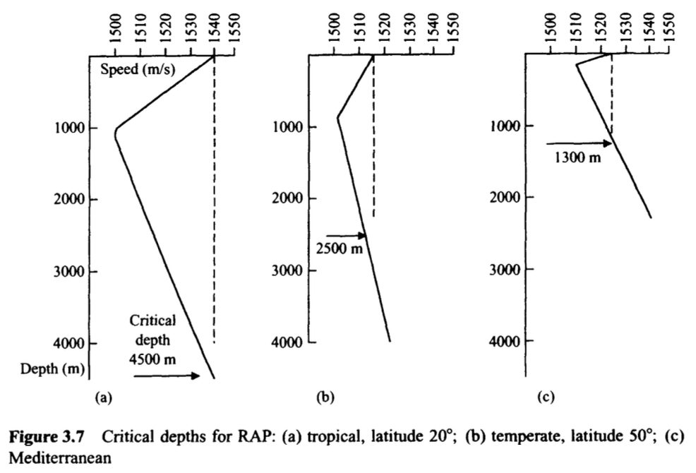 음향신호의 원천을 깊은 바다(적어도 1000m) 속에 위치함으로써 일반적으로 잠수함이 잠수하는 위치의 타켓을 탐지할 수 있다.(그림 3.6) 이렇게 소리를 얻는 방식은 가변적인 수면과 해저의 의한 손실에 덜 민감하기에 신뢰할 만 하다고 한다. 이 Reliable Acoustic Path, 일명 RAP의 조건은 음향신호의 원천이 표면과 음향 속도가 같은 정도 수준까지 내려가야 한다.(그림 3.7)