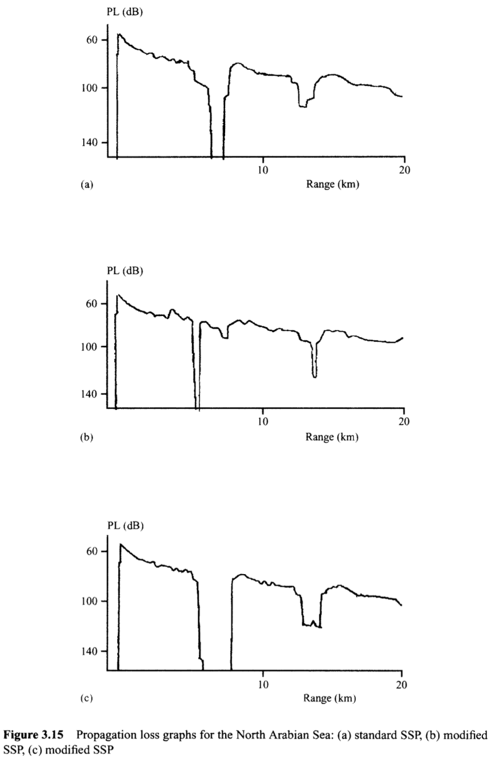 모든 그래프는 2월 중 북아라비아해의 한 지역에 대한 것이다. 2월의 '표준' SSP는 그림 3.15(a)를 산출한다. 이 SSP를 수정하여 가능한 수온계 오차를 나타내면 그림 3.15(b)와 (c)가 나온다. 그림 3.15(b)는 수심 75m까지의 모든 속도 값에서 1m/s를 빼고 다른 모든 값에 1m/s를 더하면 구할 수 있다. 그림 3.15(c)는 수심 75m까지의 모든 속도 값에 1m/s를 더하고 다른 모든 값에서 1m/s를 빼면 구할 수 있다.