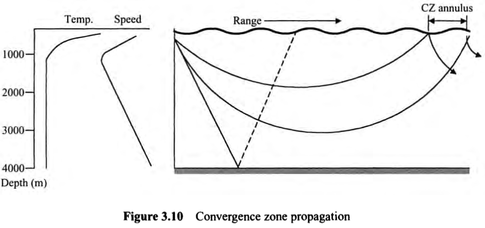 5도 이상의 각도로 발사된 음파는 최초에는 밑으로 휘어진다. 이때 Shadow zone을 형성한다. 그리고 더 깊은 곳에서는 압력이 이 음파를 위쪽으로 위어지게 한다. 이때 높은 강도의 갈고리 모양을 그리게 된다(그림 3.10). 각각의 갈고리는 Convergence Zone이라고 한다.