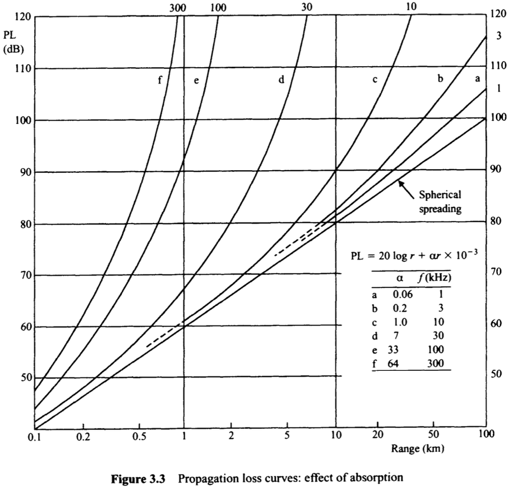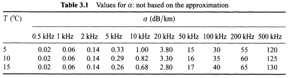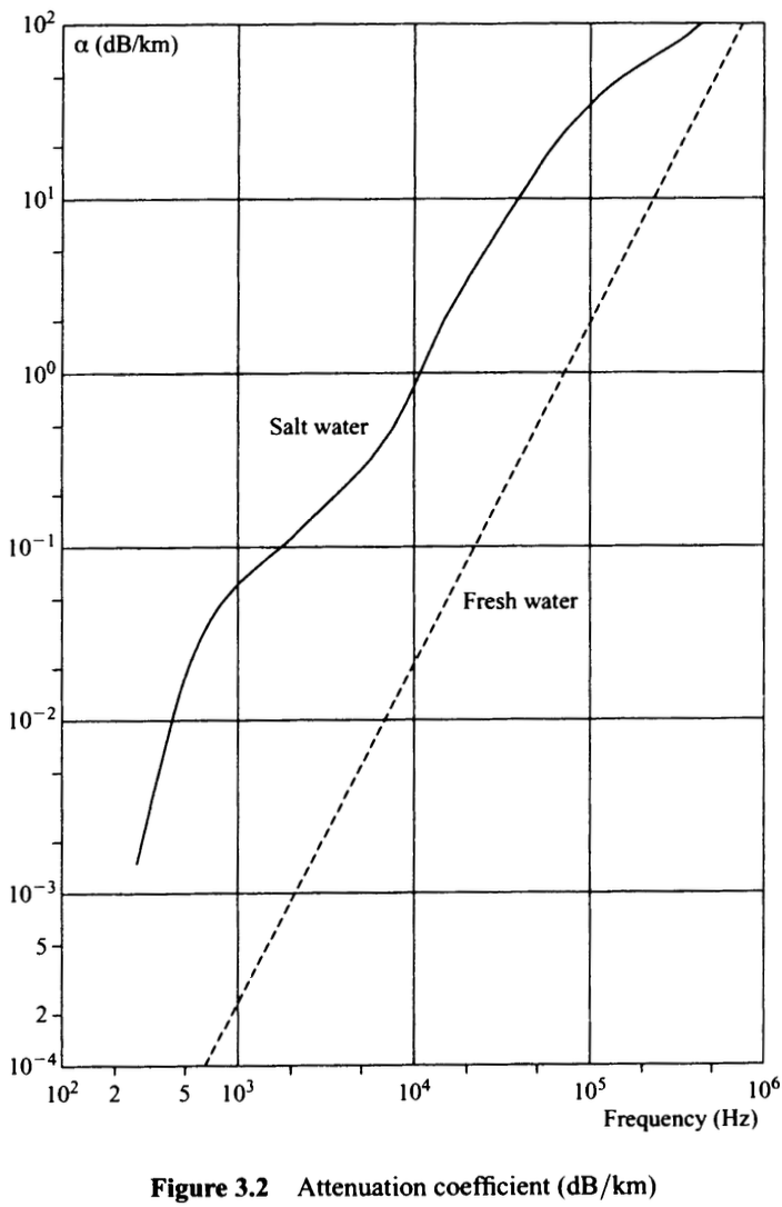 감쇠 계수 a는 주파수에 따라 급격히 증가하고 온도에 따라 변화한다. 또한 수심과 염도에 따라 달라지지만 그 강도는 덜하다. 그림 3.2는 프랑소와와 해리슨의 공식에 따라 온도 10°C와 염도 35ppt에서 주파수에 따른 a의 변화를 나타낸 것이다.