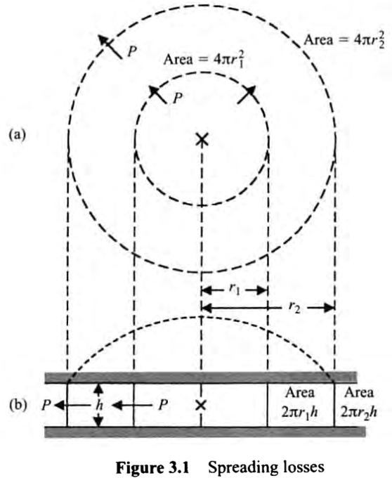 아래의 그림 3.1의 a 부분을 봐라. 음원이 무한하고 무손실의 매질에 위치한 경우에 힘은 모든 방향으로 동일하게 전파된다. 소리는 음원을 기준으로 구형태를 그리면서 퍼져나간다. 이때 소리가 아무리 넓게 퍼져도 음원에서 기원한 Power는 변하지 않는다. 그러므로 Power = Intensity X area 이다.
