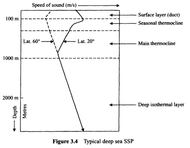 Sound speed profiles (SSPs)는 깊이에 따른 바다의 소리 속도를 그래프화한 것이다. SSP는 장소, 계절, 날짜, 날씨에 따라 다르다. 대부분의 장소에 염도는 35ppt 라는 상수로 간주한다. 그러나 몇몇 환경에서는 다른 염도를 가지고 있다. 강 하구 근처에는 염도는 매우 다양하다. 그리고 북극의 얼음이 녹는다는 것은 표면 근처의 염도가 낮아진다는 것을 의미하며, 발트해의 일부 지역에서는 모든 수심에서 매우 낮은 염도가 존재한다.