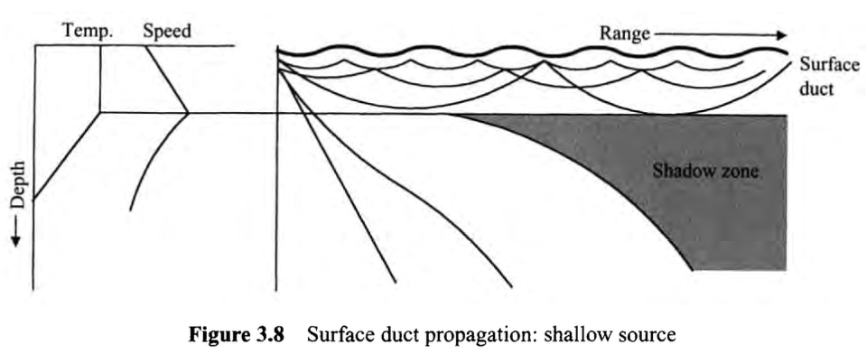 그림 3.8을 보면 수평에 가깝게 투사된 광선은 위쪽으로 굴절되어 여러 번의 표면 반사를 거친다. 반면, 층을 투과하는 광선은 처음에 아래쪽으로 굴절되어 Shadow zone 이라고 하는 영역이 생성되는데, 이 영역에서는 소리 에너지가 거의 투과하지 않는다. 따라서 Shadow Zone 내, 즉 레이어 아래에 있는 표적은 탐지하기 어렵다. 바다의 모든 전파가 그렇듯이, 단순한 ray trace가 가능한 방법은 존재하지 않다. Shadow zone은 음의 강도가 크게 감소하고 표면에서의 음의 방향 전환이 크게 발생하지 않는 영역이다.