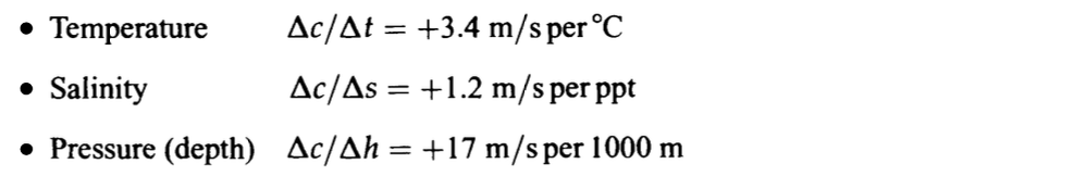 1O"C, 수심 0, 염도 35 ppt에서 음속은 149Om/s이다. 다음은 이 '표준' 음속과 함께 사용할 수 있는 대략적인 음속 계수이다:
