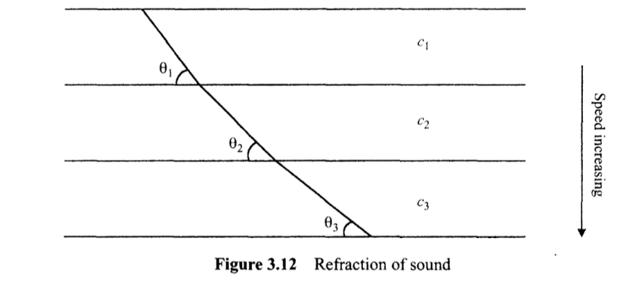 음속 필드는 깊이와 범위에서 SSP를 보간하여 계산한 다음, 환경을 깊이에 따라 음속이 선형적으로 변하는 일련의 상자로 분할한 후 스넬의 법칙을 사용하여 광선 경로를 계산한다(그림 3.12). 이것이 범위 종속 솔루션이 도출되는 방식이다.
