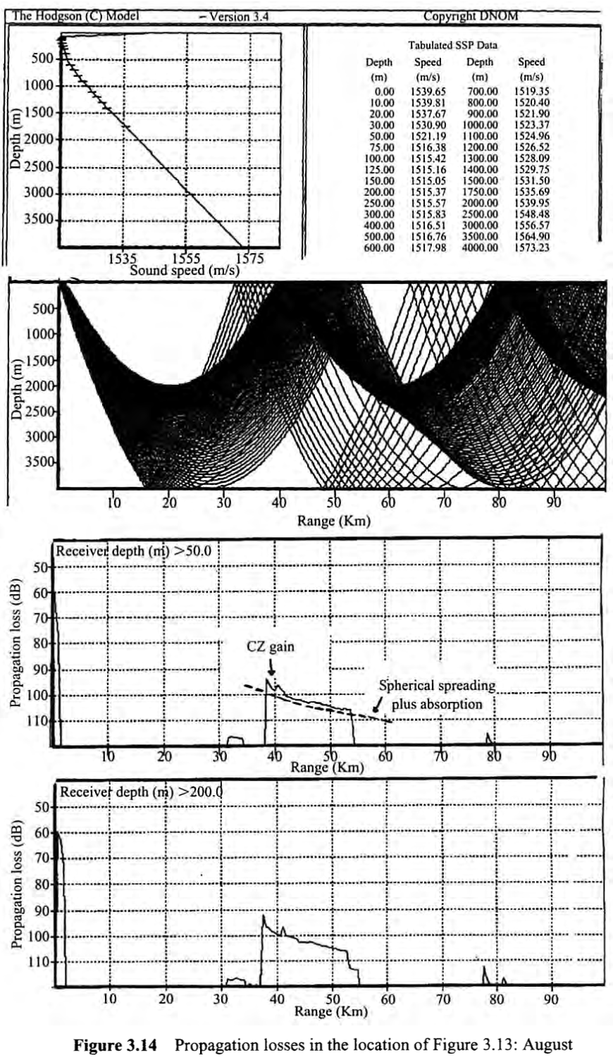 광선 추적은 약 8km에서 25km 사이의 그림자 영역을 보여주며, 이는 두 수신기 수심 50m와 200m의 PL 곡선에서 분명하게 나타난다. 특히 그림자 영역을 제외하면 구형 확산 + 흡수의 간단한 법칙이 모델 예측을 매우 정확하게 따른다는 점에 유의하라. 약 30km를 중심으로 손실이 줄어든 것은 CZ 이득이 발생했기 때문이다.