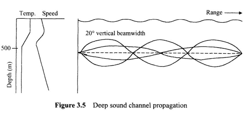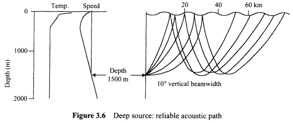음속은 온도와 깊이에 따라 증가한다. 수면 근처의 물이 더 깊은 곳보다 따뜻할 때는 수심이 깊어질수록 두 가지 상반된 경향이 나타난다.