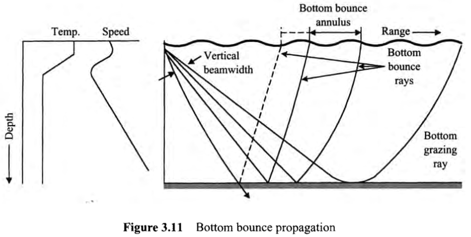 해저면을 사용하여 Propagation이 가능할까요? 당연히 가능하다(그림 3.11). 소나빔은 이제 의도적으로 비교적 가파른 각도로 아래를 향해 쏜다. 이 방식의 효과는 해저면의 흡수성과 반사성 그리고 입사각에 따른 해저면 손실이 어떻게 되는냐에 따라 결정된다. CZ와 마찬가지로 소나 빔의 함몰 각도에 따라 고리의 범위가 달라지며 작은 입사각에서는 이것이 매우 넓어진다. 한 곳에 집중에서 소리를 쏘는 것의 이익은 Bottom Bounce Propagation 상황에서는 없고 해저면 반사 손실은 일반적으로 10~20dB이라 한다. 따라서 이 방식은 프로젝터 어레이의 크기를 설정하기 매우 까다롭다.