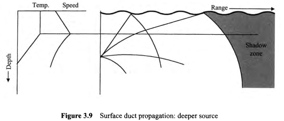 소음원이 위치한 깊이를 증가시켜 레이어 아래에 위치하도록 하면(그림 3.9) Shadow zone의 시작 범위를 미루는 효과가 있지만, 그 후 덕트까지 확장될 수 있다. DSC 및 RAP 모드와 마찬가지로 이동 중인 수상함이나 호버링 헬리콥터에서 배치한 가변 수심 소나(VDS)를 통해 심해에서 음파를 던지게 한다면 상당한 작전상의 이점을 제공합니다.