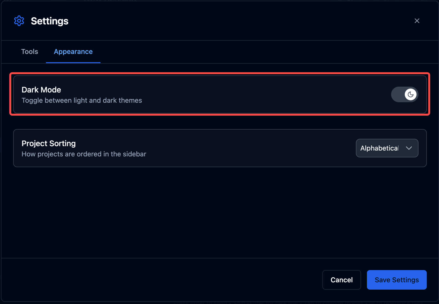 왼쪽 하단의 도구 설정을 클릭하여 설정 페이지로 들어가면, 허용할 도구와 MCP 관리를 할 수 있습니다.