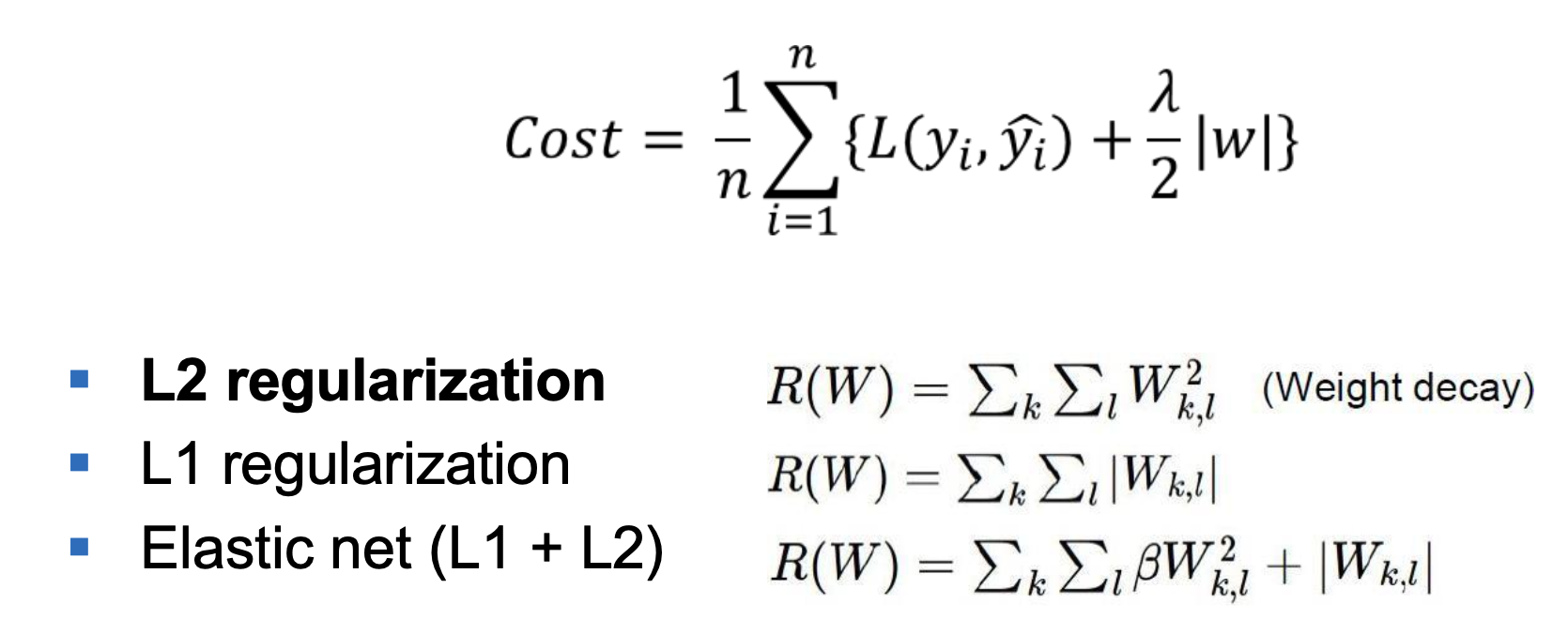 이렇게 penalty term을 W의 sum을 활용하게 되면 w를 너무 학습하는 경우 cost 가 올라가기 떄문에 특정 W를 너무 크게 학습하는 것을 막아줍니다.