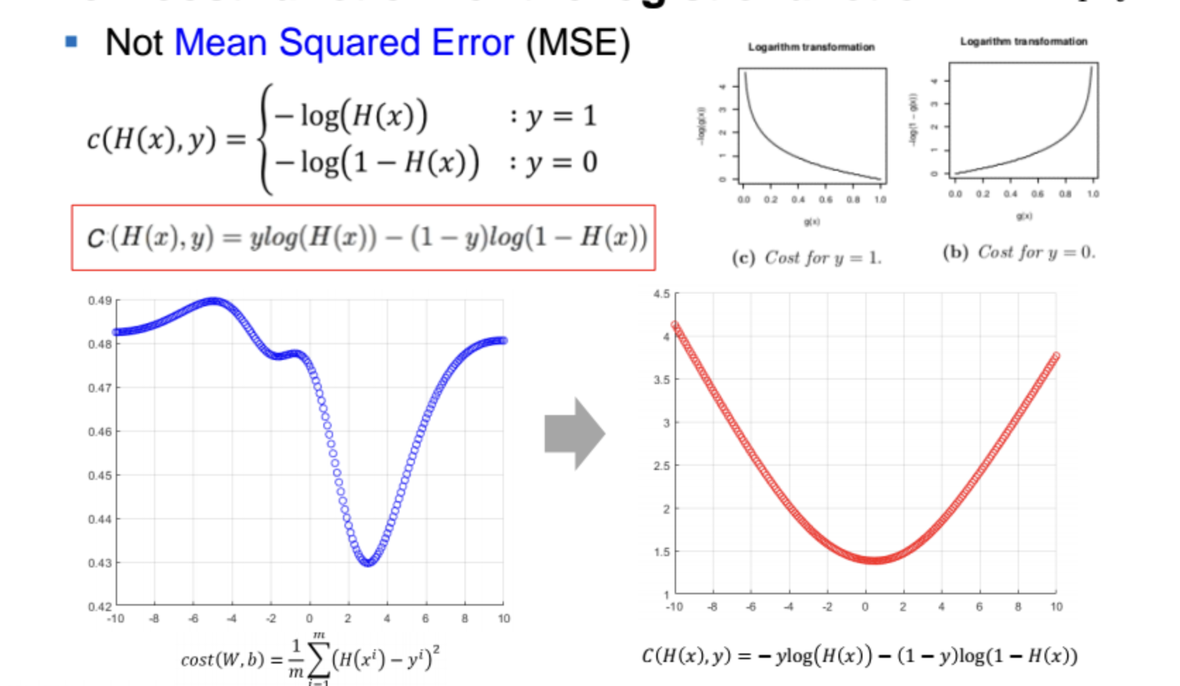 다음과 같이 cost function을 binary cross entropy로 바꿔주면 cost function이 convex 모양을 갖는것을 확인할 수 있다.