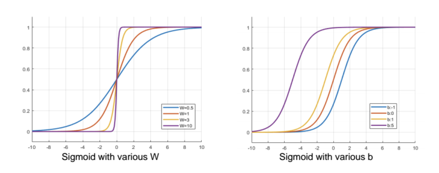 다음과 같이 W와 b에 따라서 Sigmoid 함수의 모양이 달라집니다.