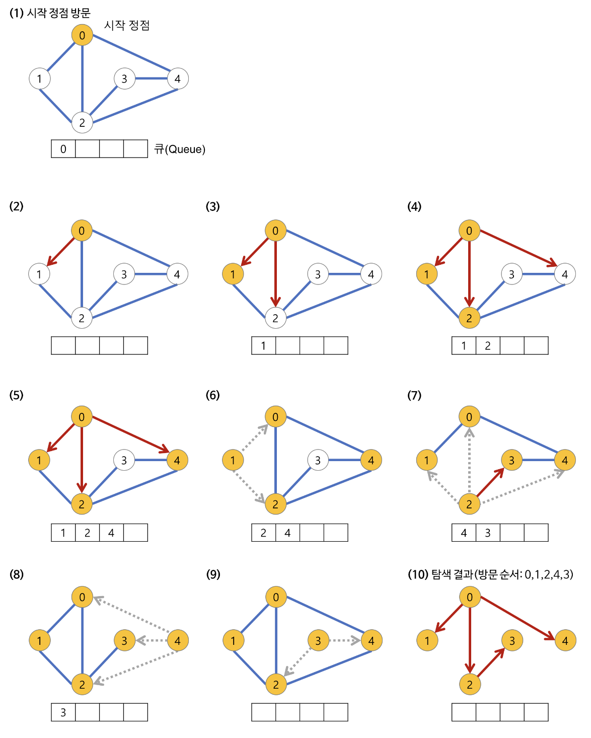 루트 노드에서 시작하여 해당 노드의 이웃 노드를 모두 방문하고 그 후 다음 노드로 넘어가는 방법입니다. 보통 최단경로를 구하거나 임의의 경로를 구하는 상황에 사용하게 됩니다.