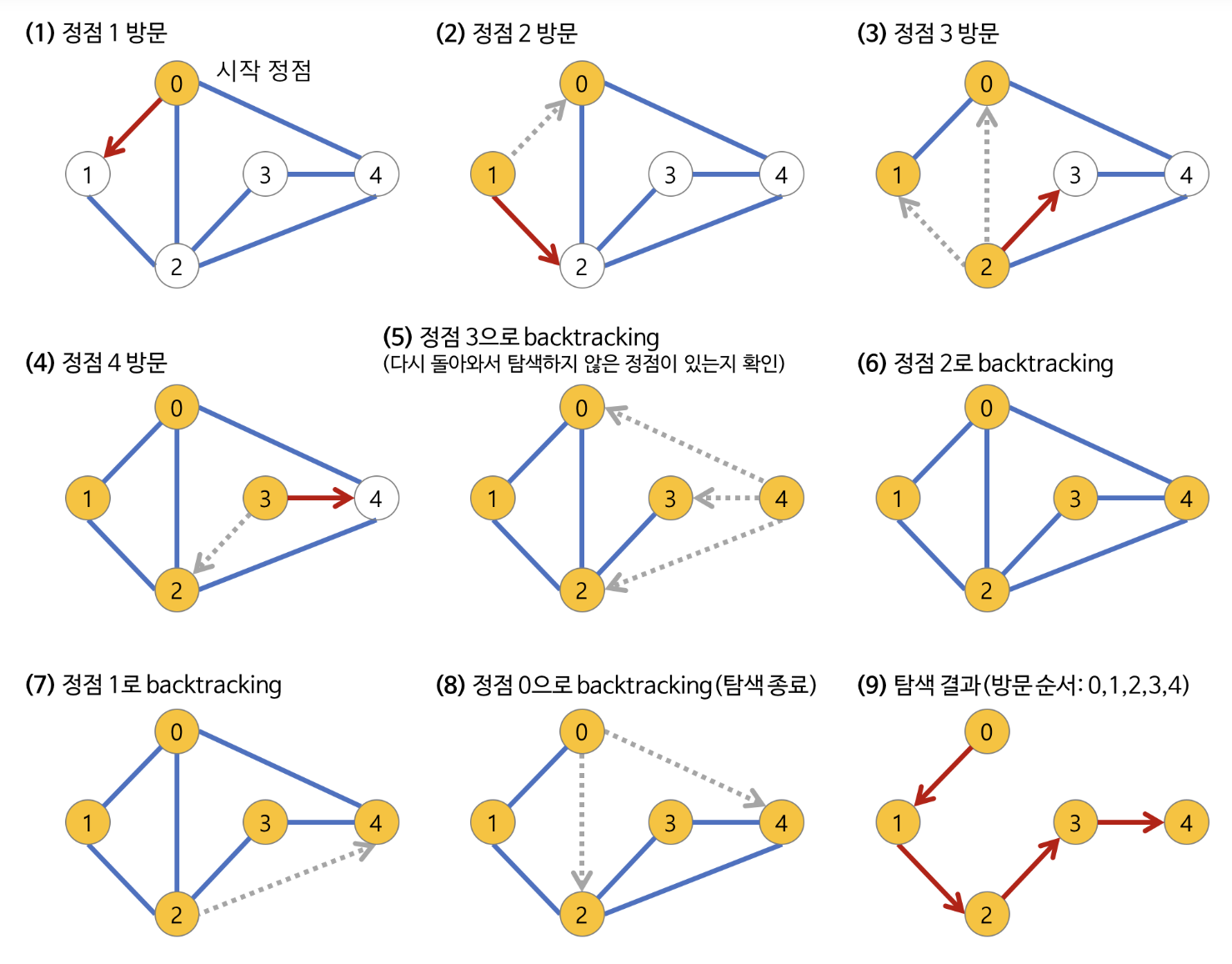 쉽게 말해 루트 노드에서 시작하여 한 방향으로 갈 수 있을 때까지 계속 가다가 더 이상 갈 수 없게 되었을 떄 가장 가까운 분기로 돌아와 다시 탐색하는 방법입니다. 보통 모든 노드를 방문하여야 하는 경우 사용하게 됩니다.