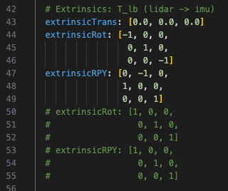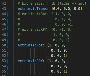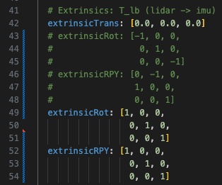 그래서 우리는 extrinsicRot와 extrinsicRPY를 우리 IMU 센서에 맞게 축을 수정해주어야 한다. 만약 IMU 센서와 라이다의 축이 동일하다면 아래와 같이 단위행렬로 변경하면 된다.