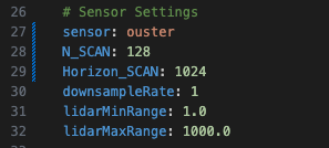 먼저 sensor 값을 ouster 로 변경하고 N_SCAN 값을 128, Horizon_SCAN 값을 1024로 변경해준다.