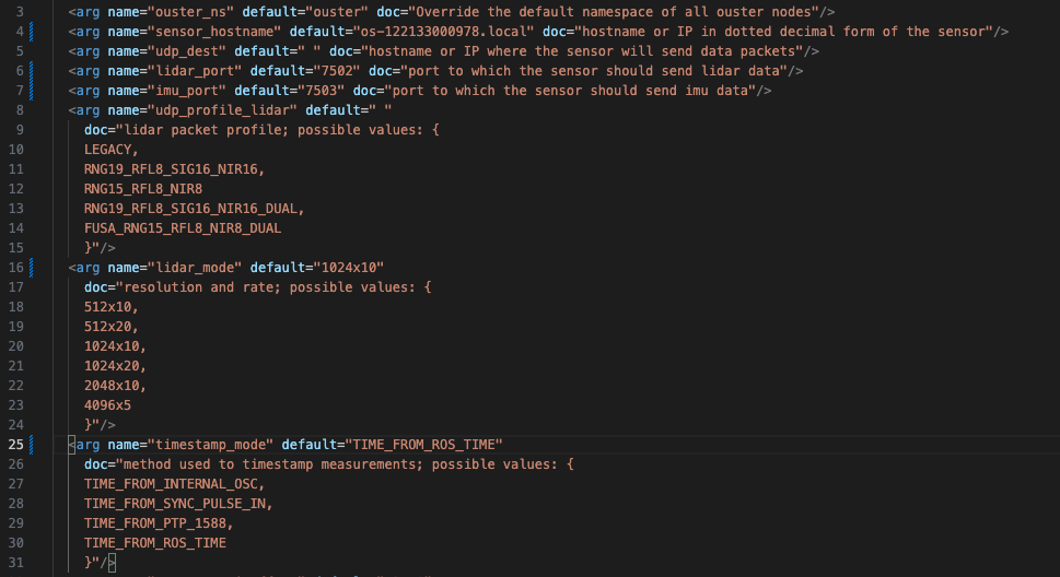 실행하기 전에 위에서 설치한 ouster_ros의 sensor.launch 파일에서도 동일하게 설정해주자.