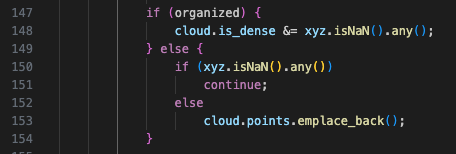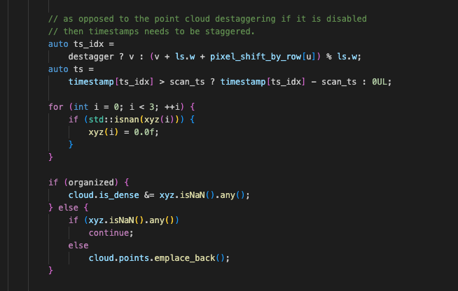 ouster_ros 패키지의 point_cloud_compose.h파일을 확인해보면 코드가 있다. is_dense는 포인트 측정 간에 값 중 NaN 값이 들어있으면 false로 판단되는 것이다.