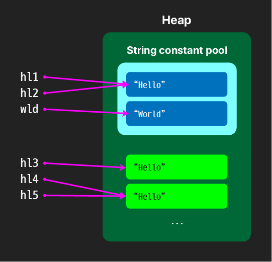 자세하게 설명하자면 너무 길어서 간단하게 말하자면 리터럴로 생성된 것은 String constant pool이라는 곳에 중복이 없게 저장된다. 예를 들어 hl1 변수가 "Hello" 로 선언된 후, hl2 변수도 "Hello" 로 선언되면 저 String constant pool 에서 기존에 있는 "Hello" 를 바라보게 하는 것이다.