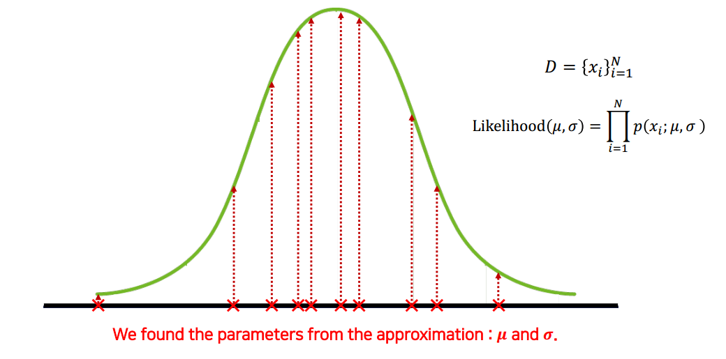이러한 시행을 무수히 반복하다 보면, Likelihood 함수 값을 최대로 하는 분포를 얻을 수 있고, 우리가 얻은 데이터가 해당 분포를 따른다고 추정 할 수 있다.