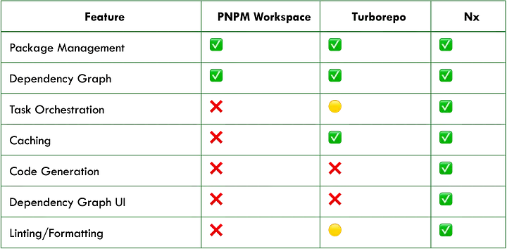속도, 효율성, 단순성에 중점을 둔 PNPM은 다양한 시나리오에 적합한 다목적 솔루션으로 돋보입니다. 그러나 Nx는 복잡한 대규모 모노레포를 관리하는 데 탁월한 반면, Turborepo는 빌드 최적화에 우선순위를 둡니다.