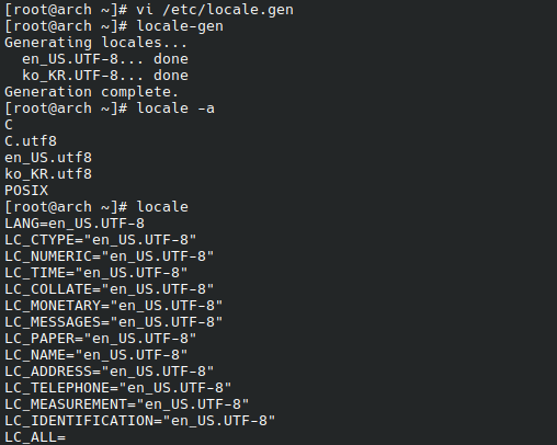 1) vi /etc/locale.gen ๋ค์ด๊ฐ์ en_US๋ ko_KR๋ฅผ ์ฃผ์ํด์ ํด์ค๋ค