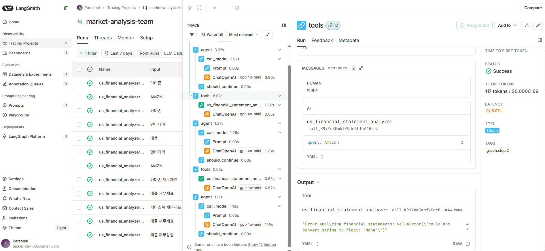 금융 분석 에이전트를 개발하던 중, 다음과 같은 오류가 발생했습니다: