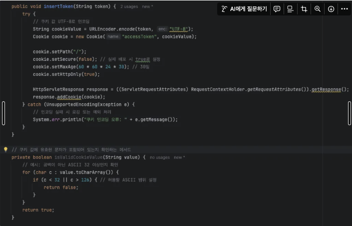 이런 형식으로 쿠키를 만드는 과정에서 여러가지 일어날 수 있는 예외 상황에 대한 대처가 가능한 코드를 추가해줬다.