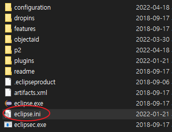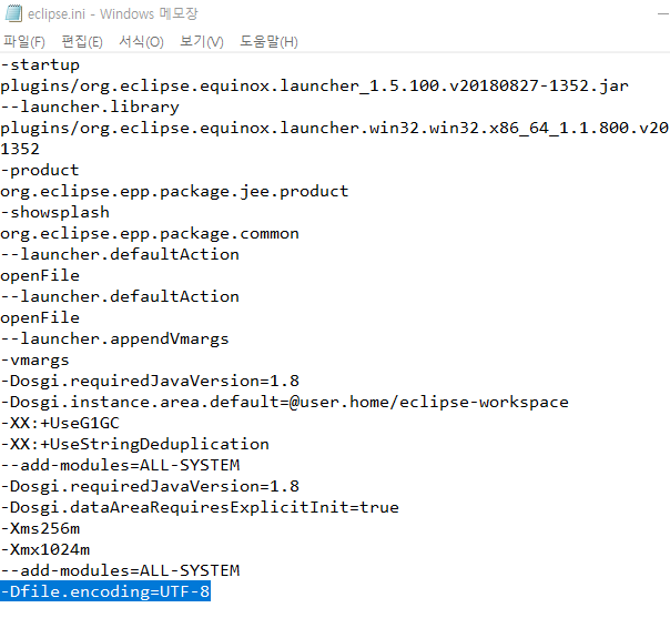 이클립스 설치 위치에서 eclipse.ini를 메모장으로 연다. -Dfile.encoding=UTF-8 추가