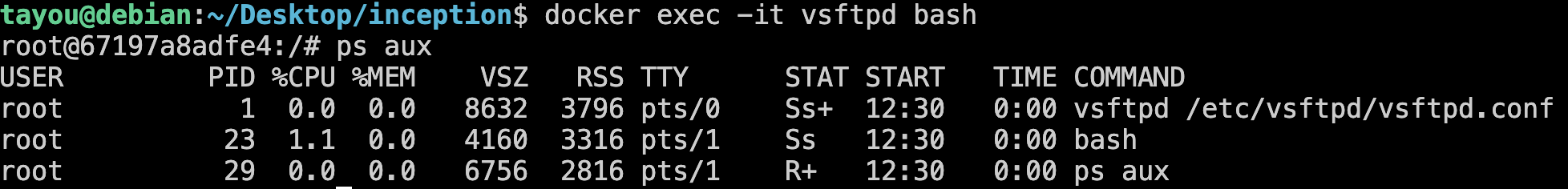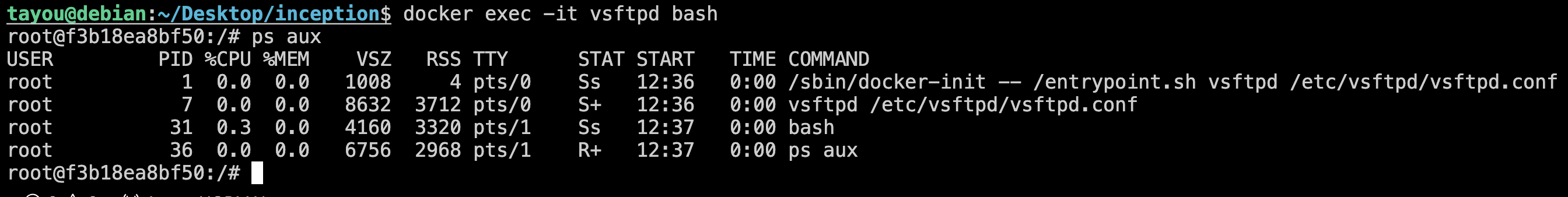다시 실행해 보니 vsftpd가 아닌 무언가 다른 docker-init이란 프로세스가 그 앞을 차지하고 있다. 그렇다면, 이렇게 된 상태에서 컨테이너를 종료하면 어떻게 될까? 다음은 그 결과이다.