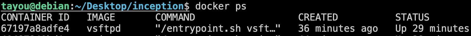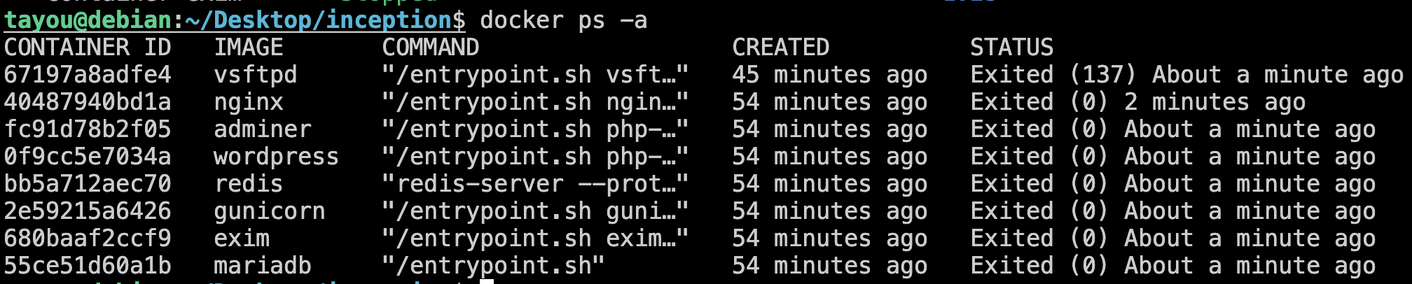 잉?? 그림에서 볼 수 있듯 vsftpd 컨테이너만 한참을 서성이다. 10초가 지난 후에 종료가 되었다. 이상하게 느껴져 docker ps -a명령어로 컨테이너의 종료상태를 확인해보았다.