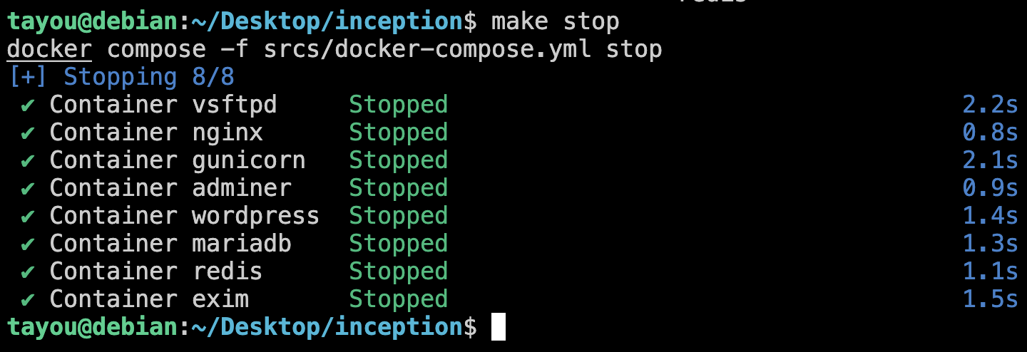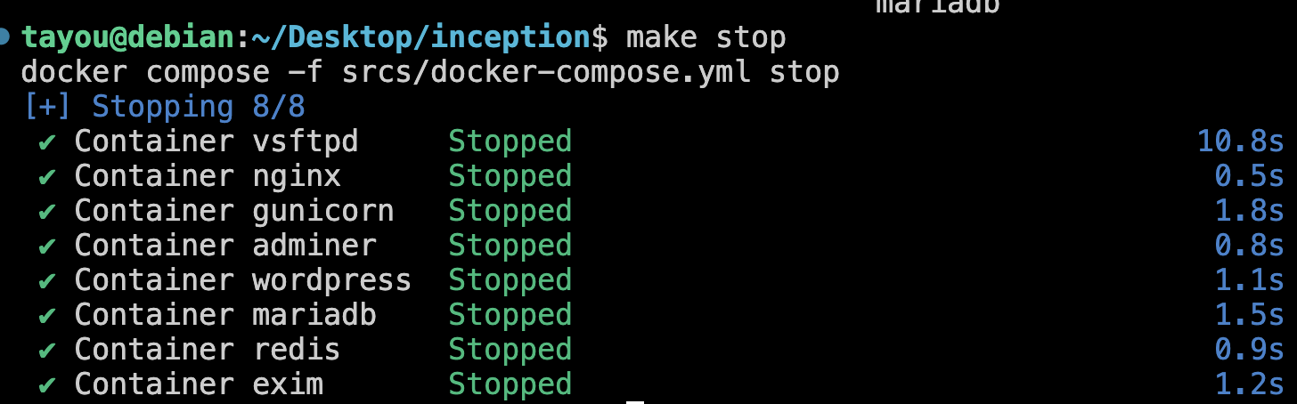 위와 같이 docker ps라는 명령어로 실행중인 컨테이너들을 보았을 때 vsftpd 이미지를 사용하는 컨테이너가 정상적으로 실행됨음 알 수 있다. 그리고 나서 한번 컨테이너를 전체적으로 종료해보았다.
