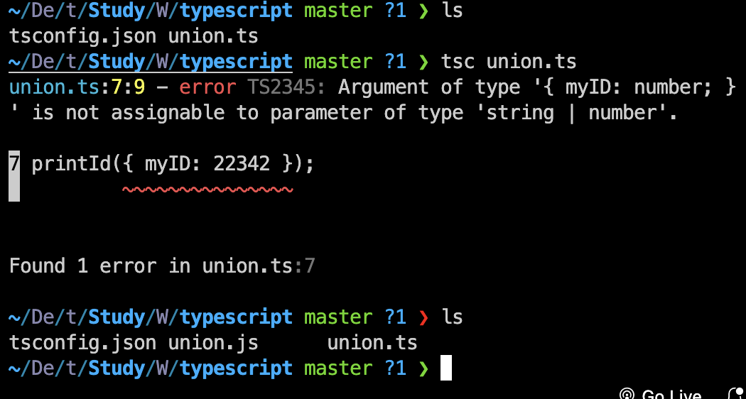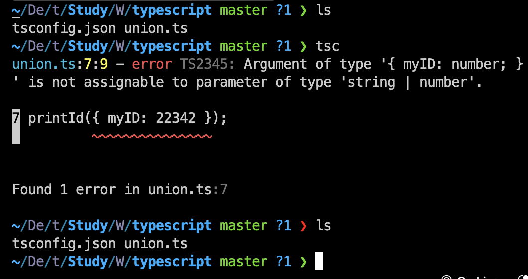 보는 바와 같이 tsc 명령어만 사용할 경우 tsconfig.json 파일의 설정값이 적용되어 union.js 파일을 생성하지 않았음을 알 수 있다.