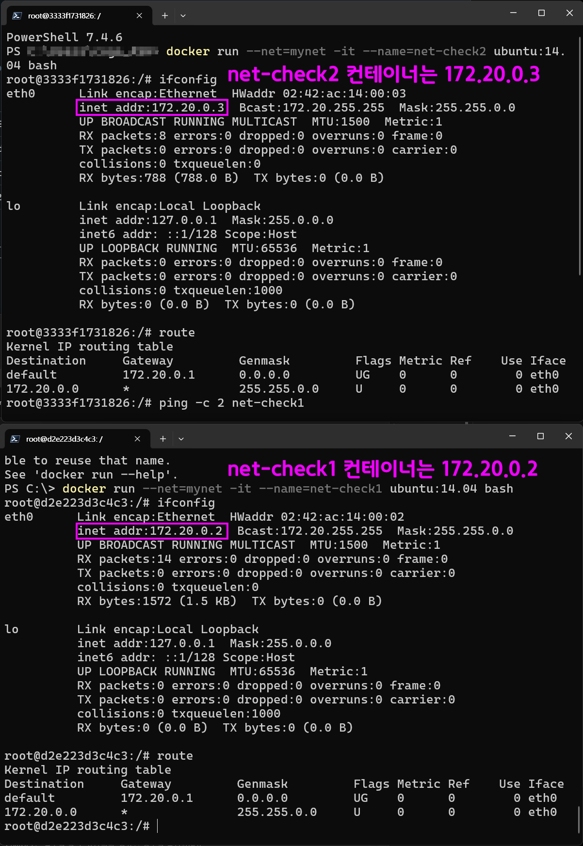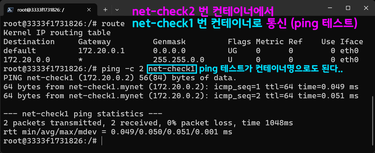 이렇게 두개의 컨테이너가 커스텀 네트워크 mynet에 묶여있으니 두 컨테이너간 통신이 가능하다.